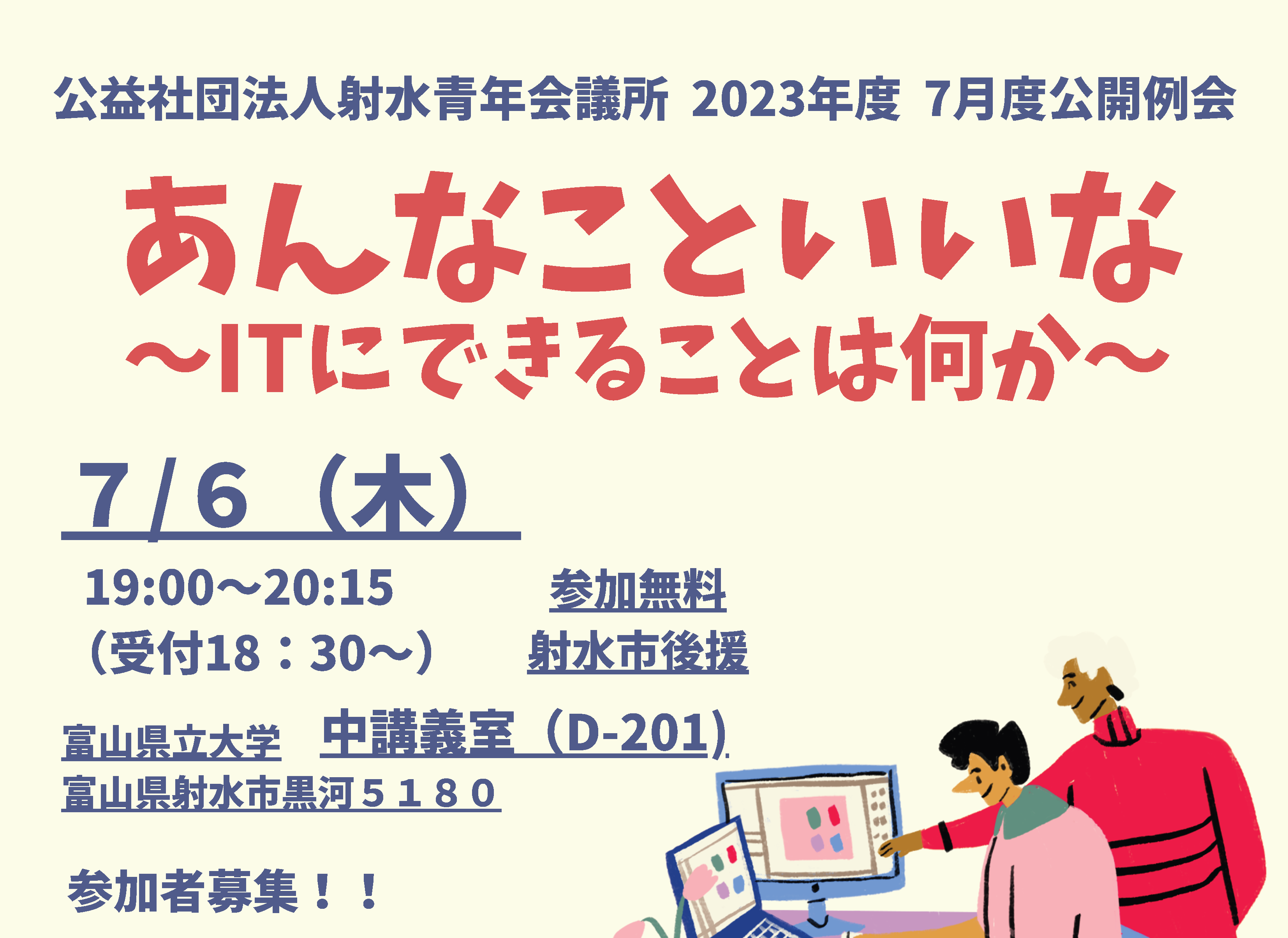 公益社団法人射水青年会議所 2023年度7月度例会 「あんなこといいな 〜ITにできることは何か~」開催のお知らせ